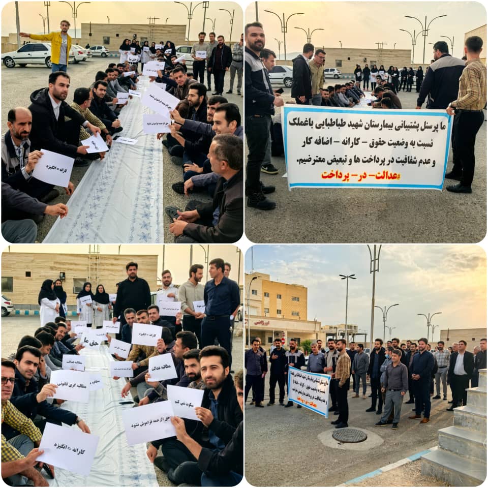 صبح امروز یکشنبه ۲۵ آبانماه جمعی از کارکنان پشتیبانی بیمارستان شهید طباطبایی باغملک با پهن کردن سفره خالی در حیاط بیمارستان، نسبت به آنچه بیعدالتی در پرداخت حقوق و مزایا میدانند، اعتراض کردند.